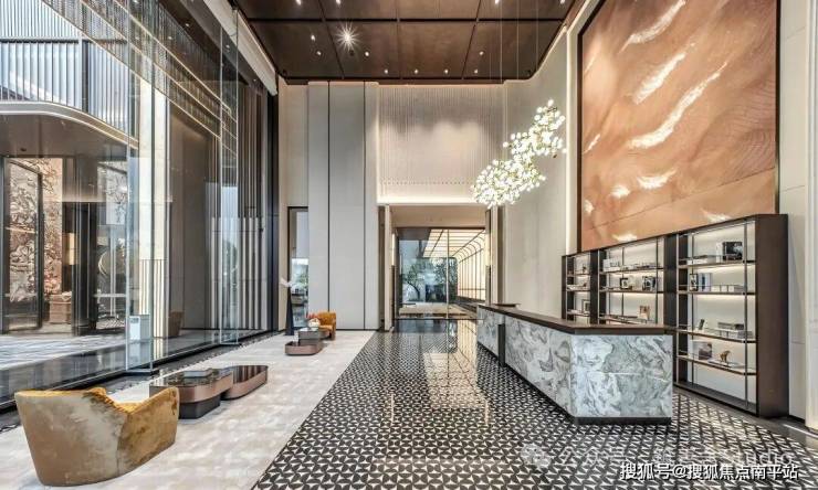 入户大堂精心打造,约4.3米层高带来极致开阔感,香槟金金属与米黄石材的碰撞,成就简奢格调。细节之处更显匠心,手工拼花地砖、黄铜地雕、岩板背景墙与金属线条点缀其间,处处流淌着艺术气息。