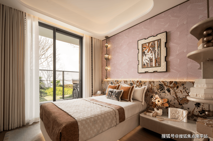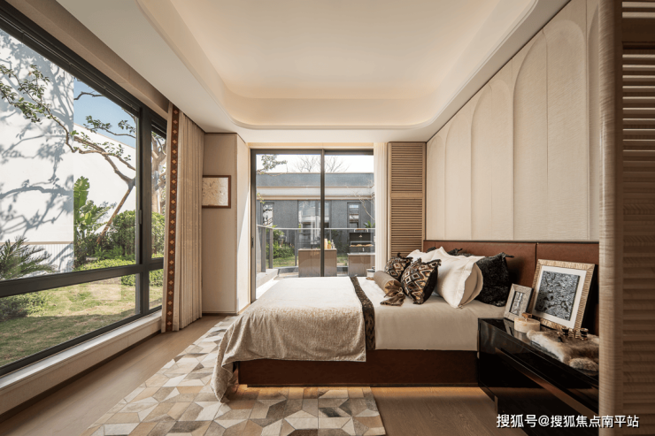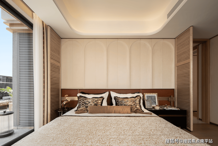 主卧窗边的自然光,与天花板的隐藏式暖光交织,为静谧的空间蒙上一层温柔的滤镜。床品的肌理、抱枕的图案,皆在无声中诉说着细腻与质感,邀请居者卸下一身疲惫。