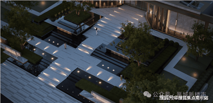 场景空间2(酒店式中庭水院):项目南入口提取地域特性,利用滨河绿地资源、商业集市、建筑生活盒子进行内外一体化体验的资源整合。规划打造滨河剧场、三进水院、街区花园、酒店式中庭景观,营造新都市归家场景,塑造酒店式栖居范本。