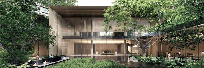 舒朗的水平线条,选用大面积通透玻璃幕墙和暖灰色铝板