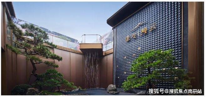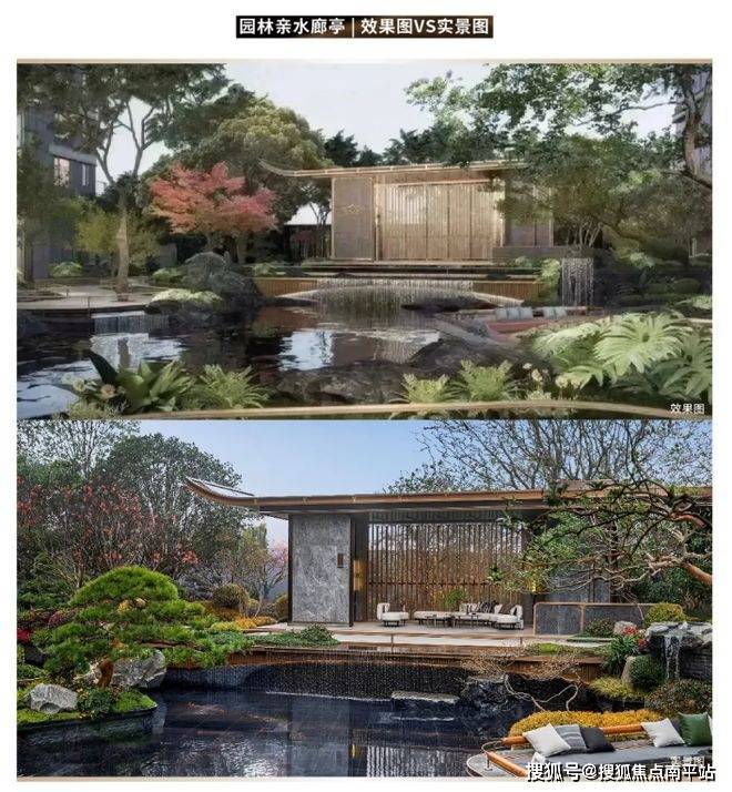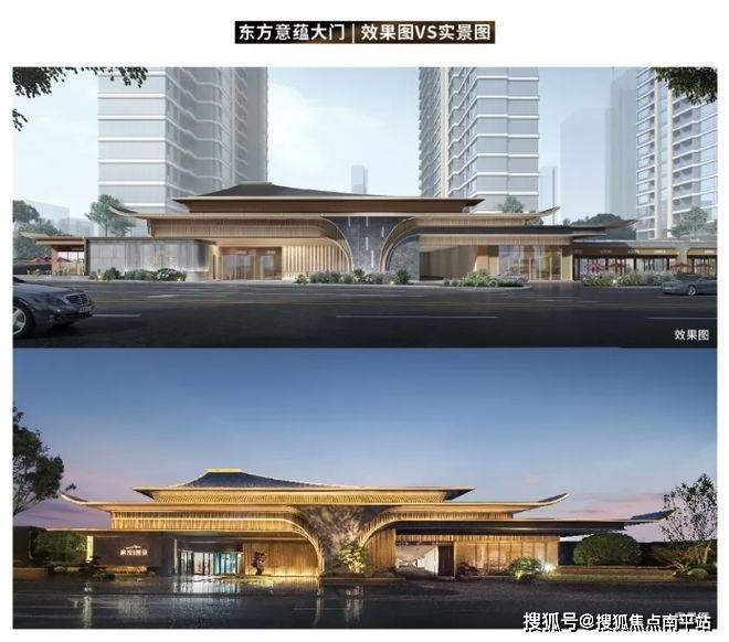 园林水系旁的东方飞檐造型金属廊亭,与大门、门厅与建筑屋檐形成一个视觉整体;相比效果图中金属装饰面与石材面色彩的相似呈现,实景中的墙面采用浅灰色石材,实际呈现更生动高级。