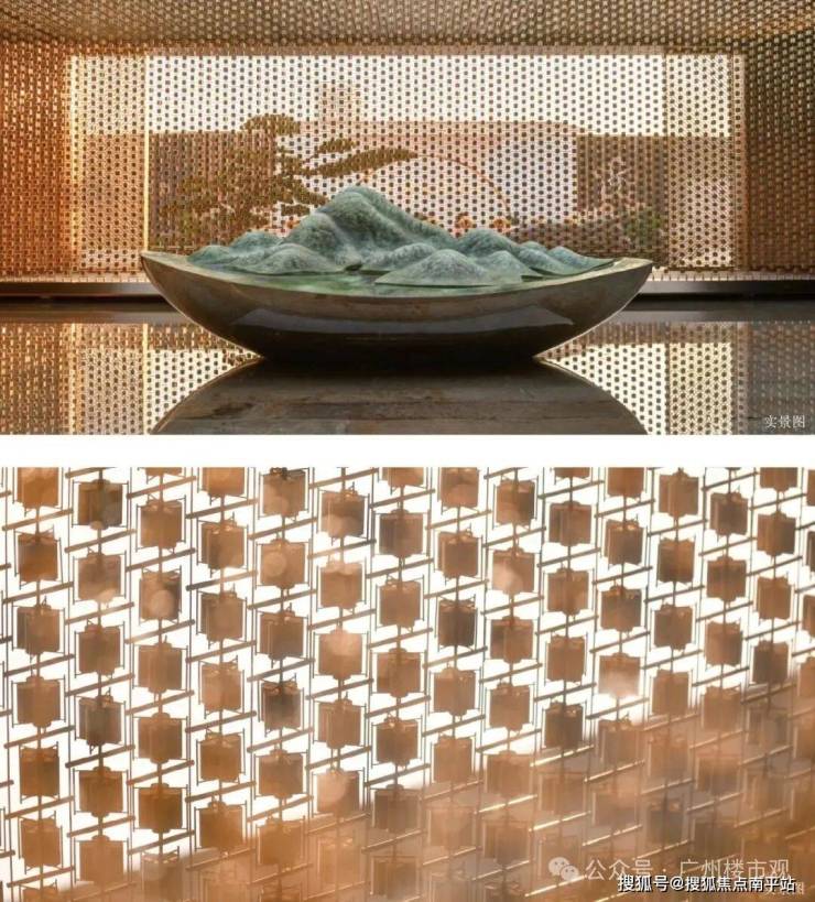 【泗水归堂】取春天清风徐来、水波不兴的意象,以“广绣隐现、幕墙灵动”为设计概念,打造泗水归堂空间入口照壁屏风,彰显归家尊贵感与品质