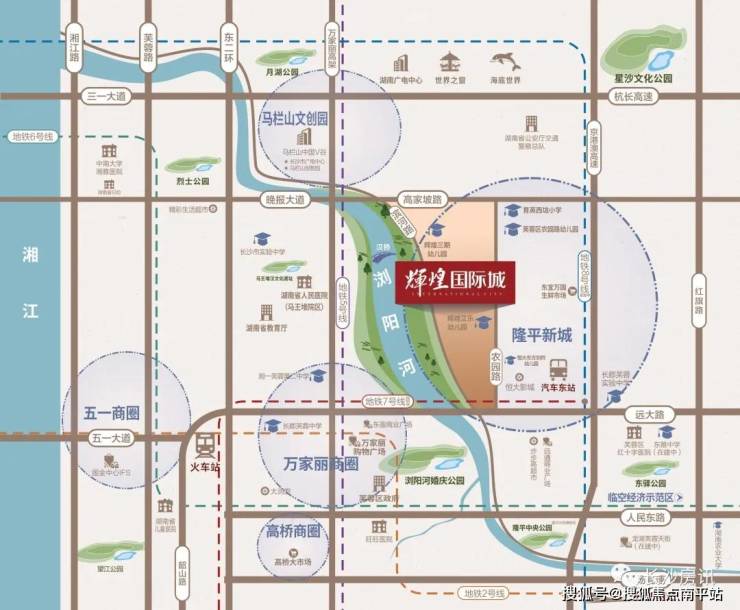 辉煌国际城,位于芙蓉城央、浏阳河与远大路交汇处,地处浏河板块核心;西通长沙中心主城区,东连空港新城板块,北连马栏山视频文创产业园和星沙经开板块,南达武广高铁板块,扼守四大板块黄金C位。