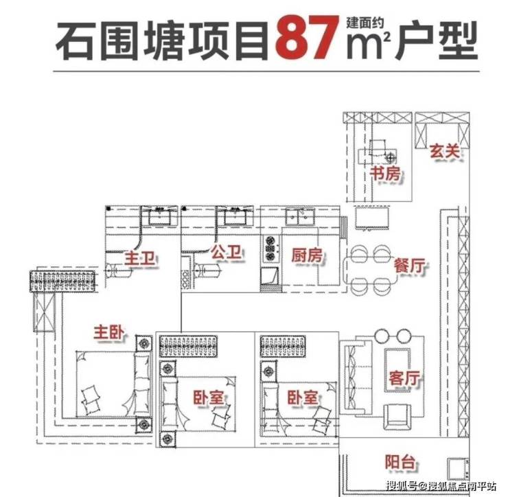 建面约87㎡四房2卫,,使用率为113%-120.5%。竖厅的为带独立玄关的竖厅布局,动线清晰;单边位设计,实现南北对流,并拥有U型采光面,主卧观景与采光效果更佳。在不足90㎡的空间内实现四房功能,极大提升了空间利用率。