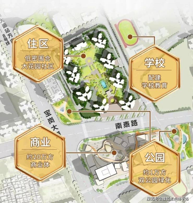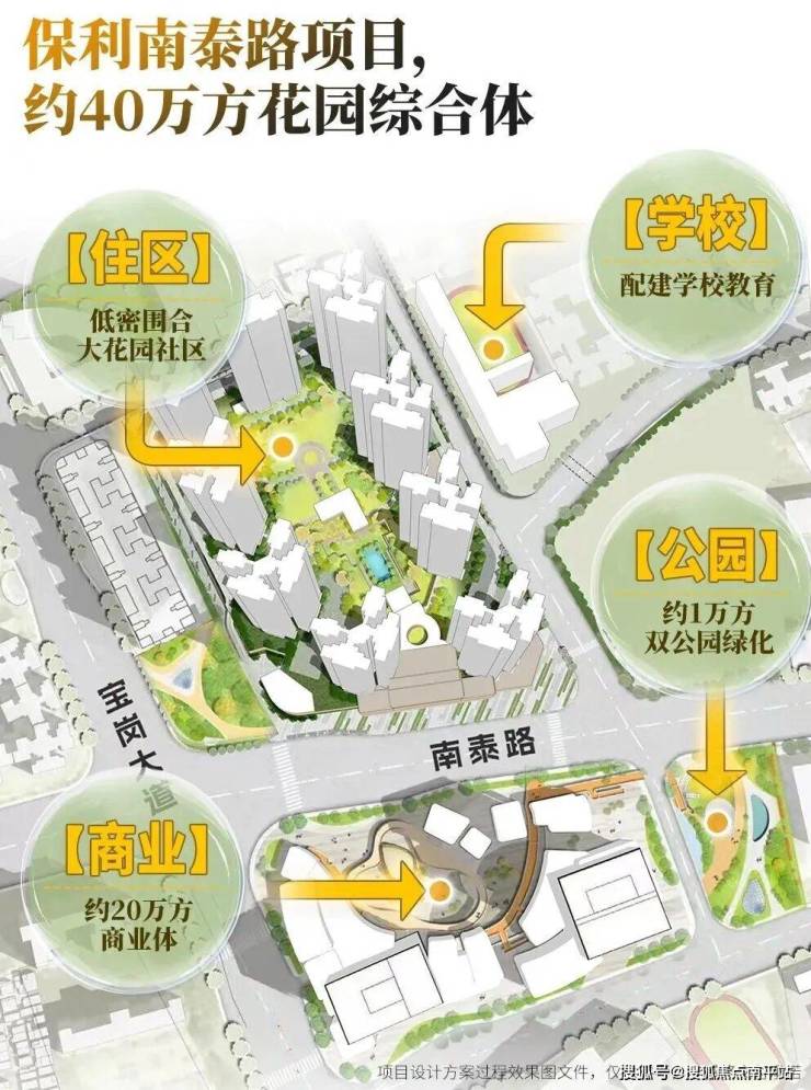 保利南泰路项目,以大盘主义,聚合学校、公园、商业、住区,通过十字街区无缝连接,打造老城罕见的“花园综合体”。