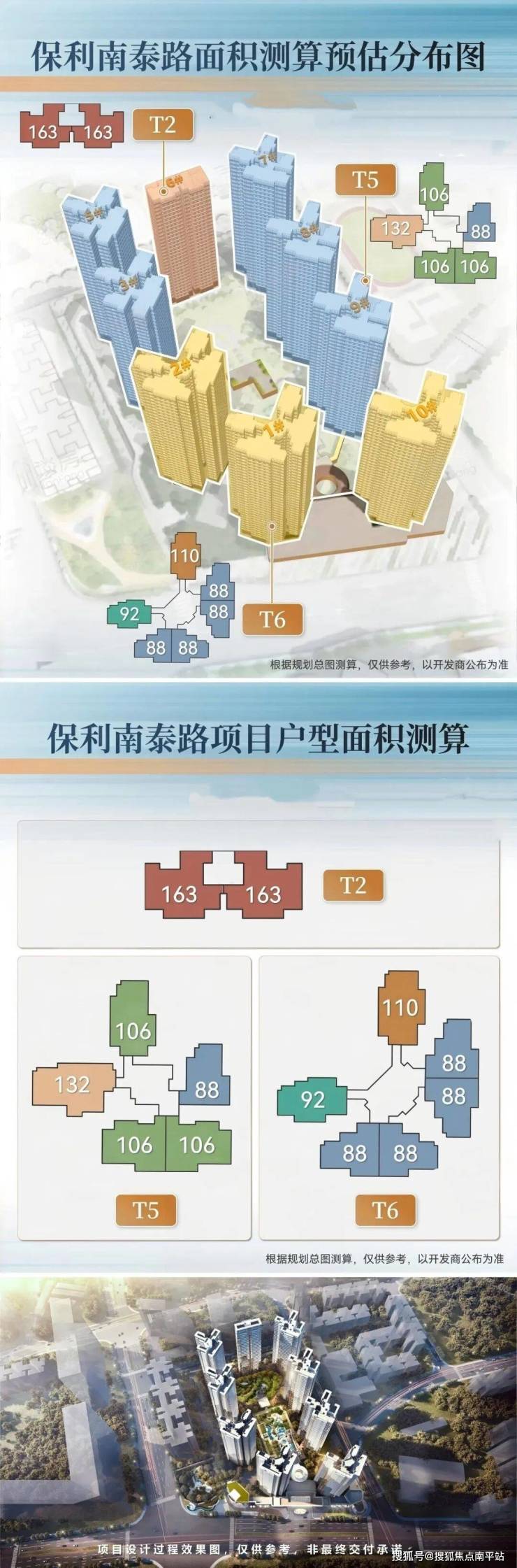 其中,1栋、2栋和10栋为一层六户(3T6),5栋、3栋和7-9栋为一层五户(2T5),6栋为板楼设计(2T2)。