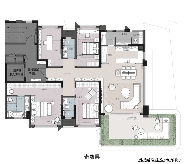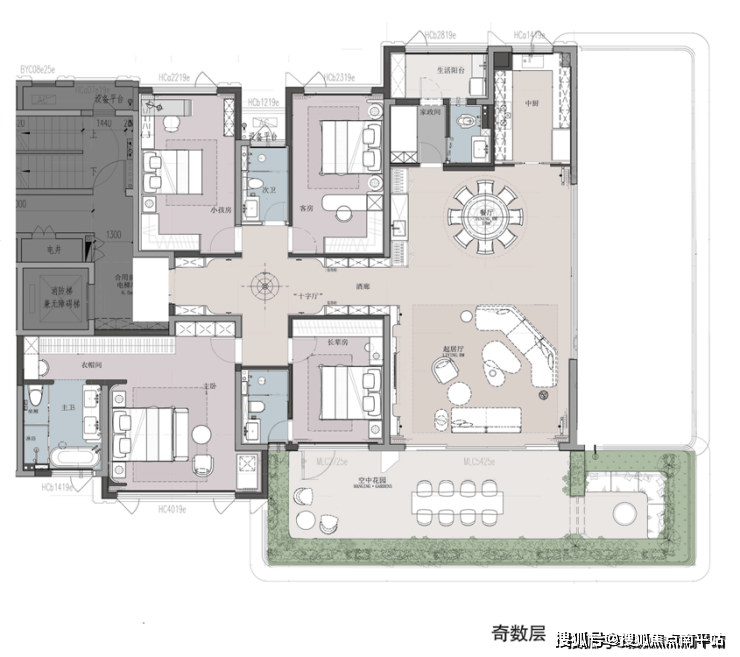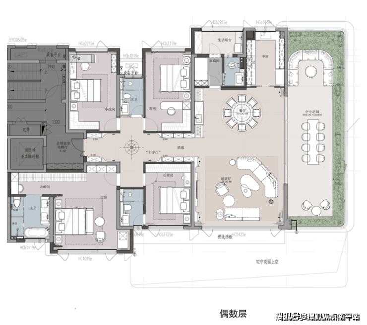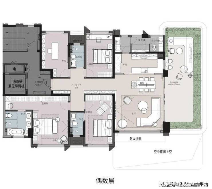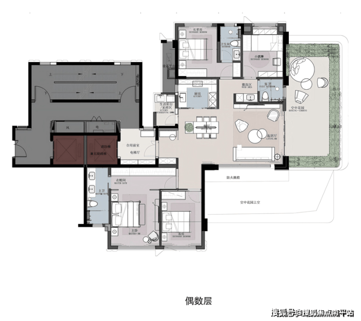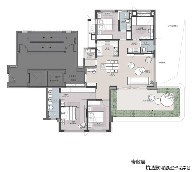 该户型同样也做到独立电梯厅,同步大平层居住体验;约35㎡空中花园270°环幕观景视野与LDKG一体化边厅连接,彰显闽南大宅气场;奢华双套卧,其中南向超大酒店式主卧套房双台盆主卫+衣帽间+大窗设计,进一步提升奢居体验。