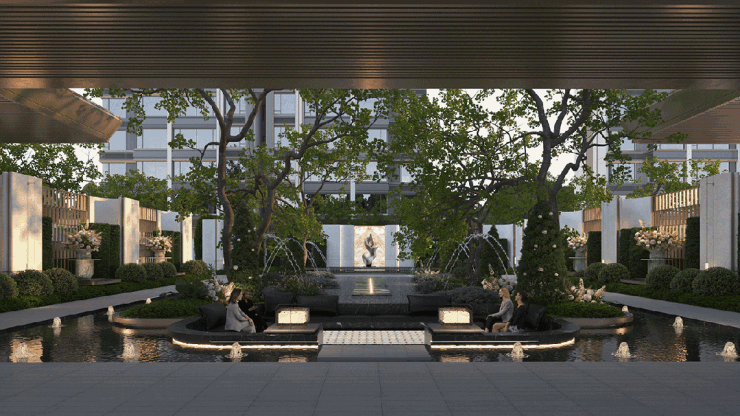 酒店式双主入口构建尊崇归家礼序,艺术隐奢级超长城市界面,搭配奢石名木,匹配高端生活的格调。