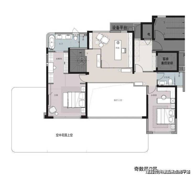 ❸ 上下两层动静分区,可实现奢华双套卧空间,双台盆行政次卧套房、步入式衣帽间+双台盆豪华主卧套房,互不打扰,独立性和私密性更强。
