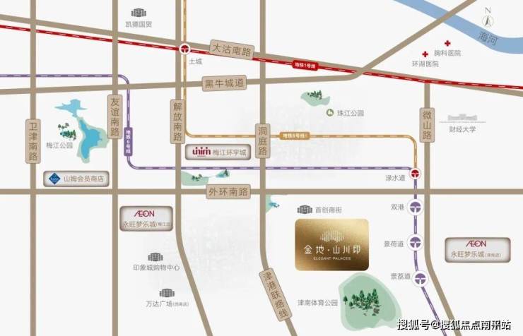 河西区作为天津改善型置业者的大本营,人口众多,区域经济实力强劲。金地·山川印与河西区仅约3公里的距离,周边紧邻地铁8号线(在建中),距地铁6号线景荷道站约500米,2站到河西,6站到梅江会展中心。周边5公里内拥有梅江山姆会员超市、梅江环宇城、梅江永旺、西青万达等多个大型商业综合体,满足日常购物、休闲娱乐需求。