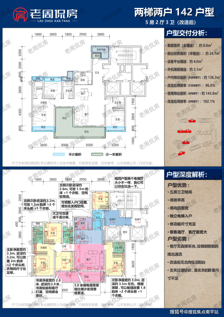 可以改造成5房2卫,户内面积约138.5㎡,得房率约97.5%。