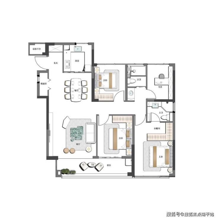 建面约 138㎡户型则 空间感更足,舒适度更高。玄关处多功能空间的设计,可以打造为收纳房 、收纳柜 等 ,打开了生活更多的可能性。南向大阳台,配合餐客厅的通厅设计,使得整个休闲功能区能够完全连通,采光、通风非常棒。