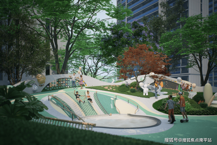 再比如三境童话剧场,近 1200㎡依托天然坡地打造的户外聚场 ,针对不同年龄段的玩耍需求设置不同游玩场景,让孩子们的欢乐天地延伸至楼下的户外空间。