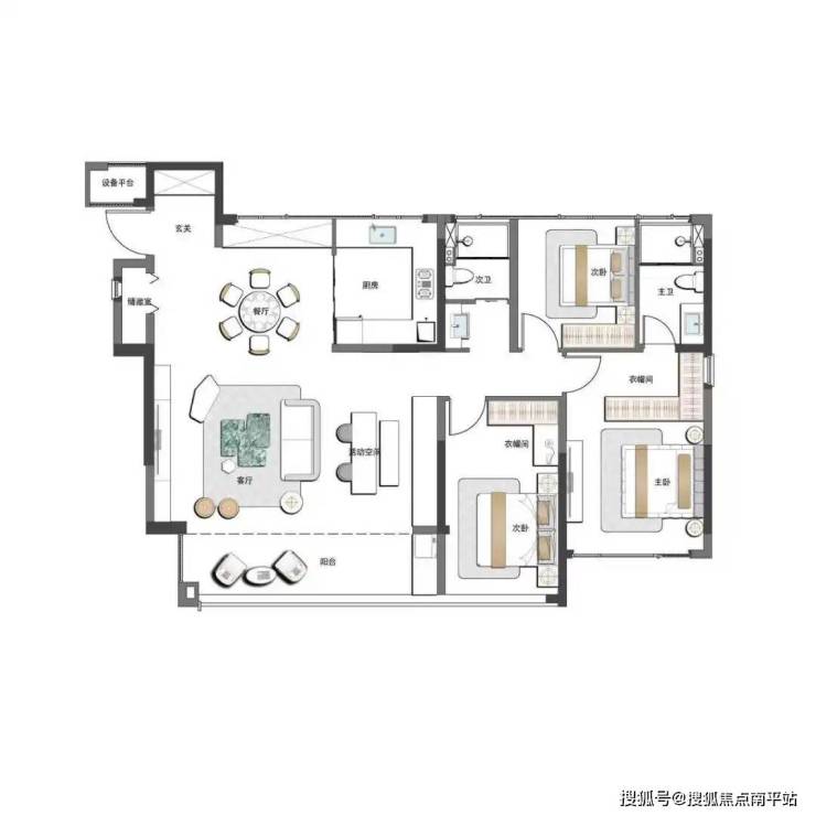 令人眼前一亮的还有 双主套设计 , 能更好尊重家人生活习惯与边界,避免两代人生活干扰,并且拥有独立的生活空间 。尤其是主卧套房,自带独立衣帽间,屋内配置 双台盆 ,直接叠满 buff。