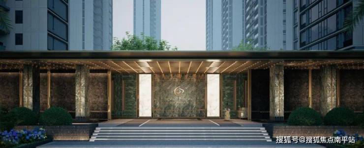 宽约 66米的巨幅归家界面,以“引凤归巢”为设计灵感,入口两侧以六根普拉达绿奢石精心排布,臻饰香槟金色“灵感金线’ ,设计手法取意建筑大师-卡洛·斯卡帕的叠级美学,敬呈名门归家的奢雅礼序。