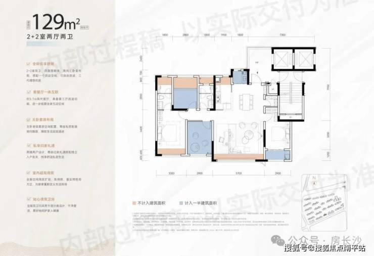 以129㎡2+2房户型为例:四开间朝南,南向三卧室,搭配一个灵动空间,可自由改造,主卧、主卫、次卫和厨房均带飘窗,再加上阳台赠送面积,实现更高得房。