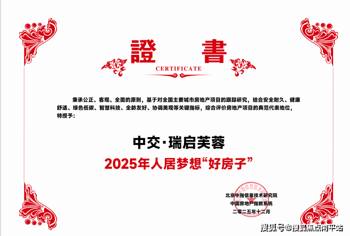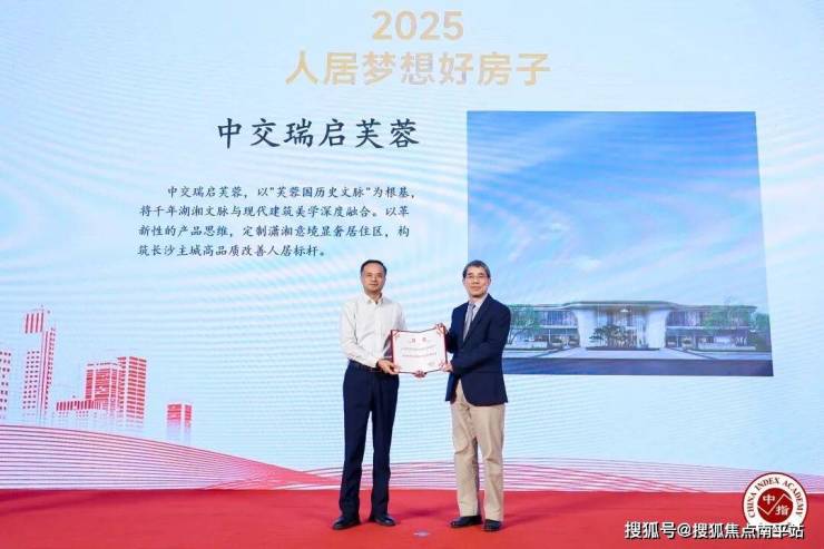2025年12月11日,由北京中指信息技术研究院主办,中国房地产指数系统、中国物业服务指数系统承办的“2025中国房地产大数据年会暨2026中国房地产市场趋势报告会”在北京召开。项目位居长沙东拓核心——隆平芯谷,代言长沙主城高品质改善人居标杆的中交瑞启芙蓉,凭借顶级的城市配套、卓越的产品力,以及对理想人居的深刻践行,荣获【2025 年人居梦想 “好房子”】殊荣。