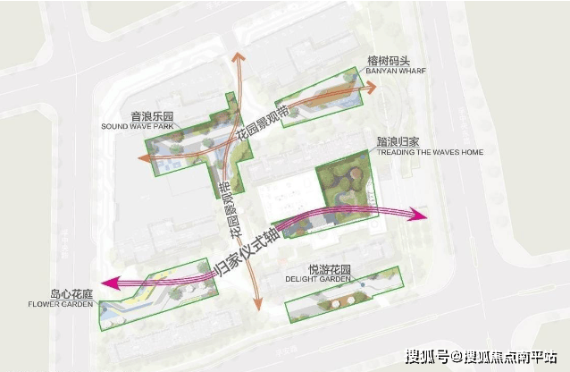 【一轴两带五园 营造美好归家仪式】 萃取厦门鼓浪屿自然风光,以林、岛、浪、石作为景观元素,打造鼓浪屿风情主题景观轴营造归家主动线,构建踏浪归家、榕树码头、音浪乐园、岛心花庭、悦游花园等全龄段社区休闲配套。