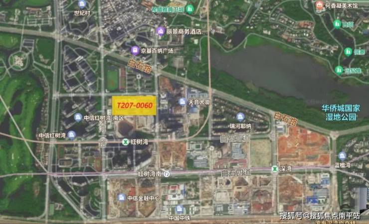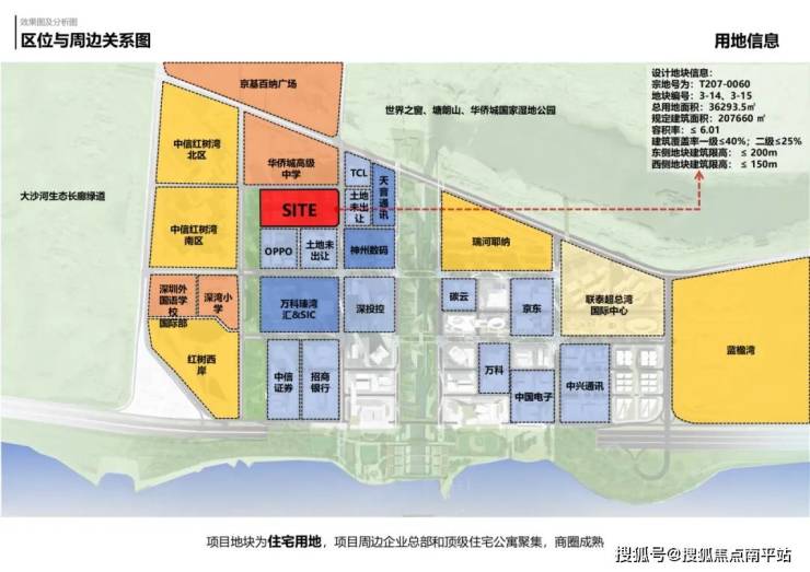 地块位于深超总片区,靠近2号线红树湾站约200米,一路之隔就是知名的万科臻湾汇项目,西侧是深圳湾超级总部基地城市展厅和中信红树湾豪宅楼盘,北侧是南山实验教育集团华侨城高级中学。