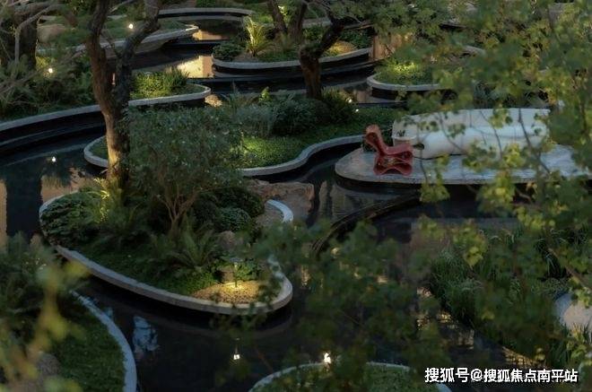 借鉴虹夕诺雅度假酒店灵感,将浮岛溪涧的度假场景原般复刻。开敞辽阔的公园景观中,贯穿辗转生韵的漫赏步道,在步道之间,设置大量小尺度空间,于溪涧浮岛、林间绿幕、岩壁景墙处,均设置下沉赏景休憩点,解锁社交及更多场景的发生。