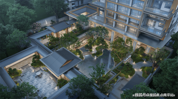 由门而入,园区里一步一景,长廊、亭台、珍稀花木……层层院落,构建长达 约130米五进景观轴, 约2300米双层游园步道,世界羽毛枫、紫薇等珍稀花木点缀, 近百种植物搭配,将东方诗意融入日常,形成“园中藏园”的层次感。