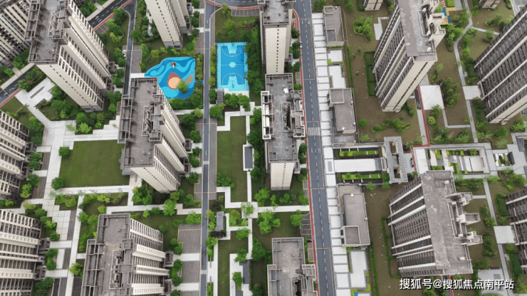 从高处看,两个地块之间有明显的道路分开。左边已交付的区域,小区规划了一些配套场地,像是篮球场啊、儿童设施。