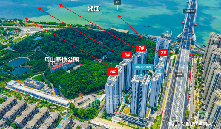 阅江逸府,南侧是母山基地公园,山体不大、高度有限,不遮挡江景视野,又缓和江水直冲;山中有水(湖),纳湘江水入内,聚财;阅江逸府背后,还有鹅羊、秀峰双山,大山、高山,以其为靠,藏风聚气。高山为靠、江水为伴、小山聚财,真正的山水宝地!