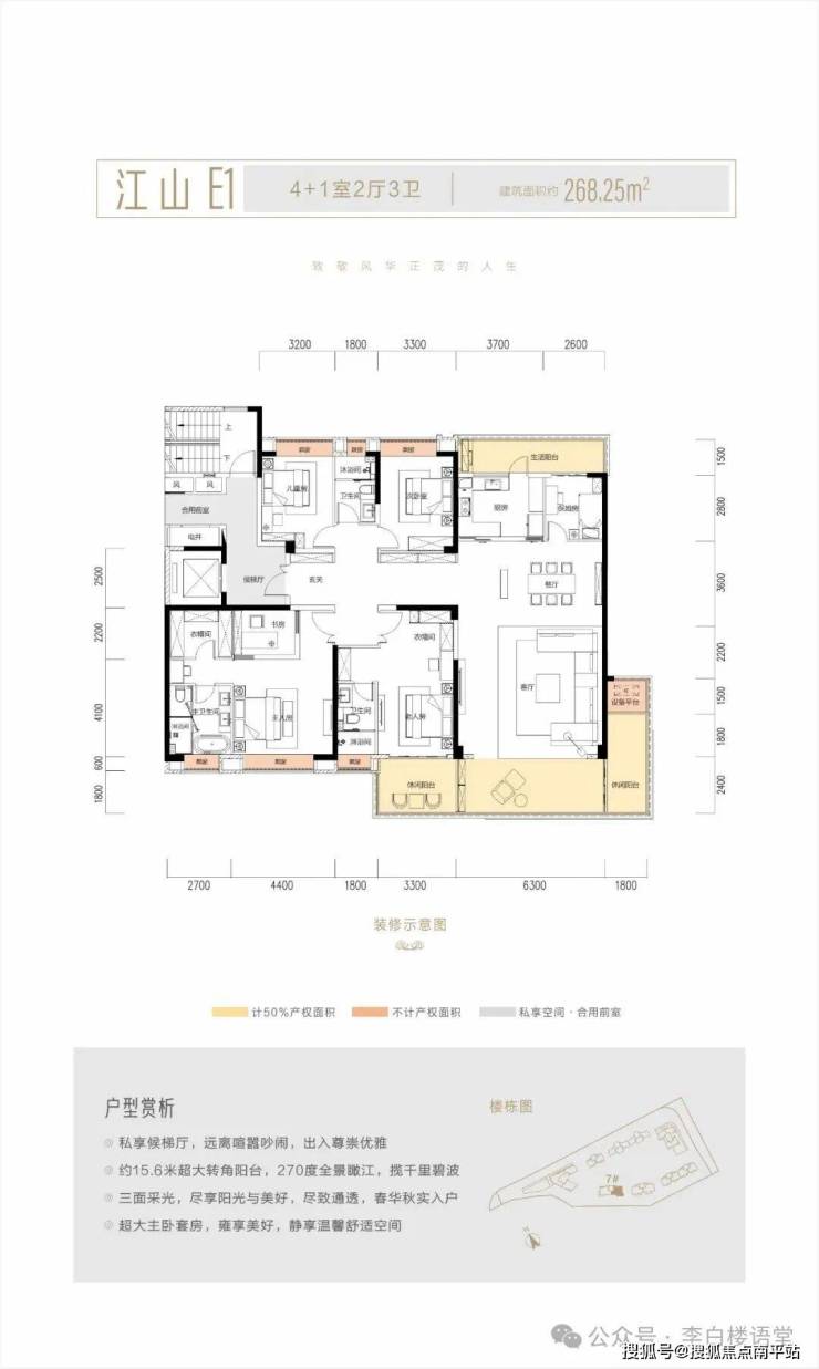 楼盘第一排无遮挡大江景视野位置,布局三栋住宅,全部是200㎡以上大平层,两梯两户纯板楼+私梯入户设计,层高约3.15米,远超市场标准。产品为 建面约211-268㎡江景大平层 ;