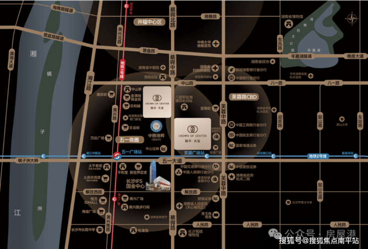 项目位于正市中心,五一广场与芙蓉广场之间,距离地铁1号线五一广场站约600米、2号线芙蓉广场站约700米,尽享五一广场、芙蓉广场周边成熟配套。教育方面,未来预计配套入读中雅培粹品牌九年制学校。(学区划分,学校引入品牌事宜,以正式文件为准)