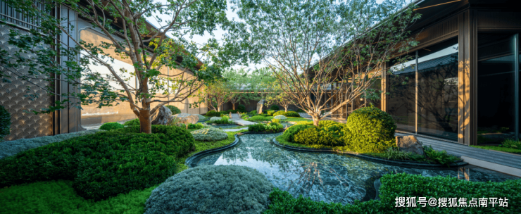 元宝枫、山桃等绿植的加入,充分还原了《桃花源记》中“忽逢桃花林”的场景,表达对美好生活的向往,业主可以在这里放松身心,实现自我的疗愈。