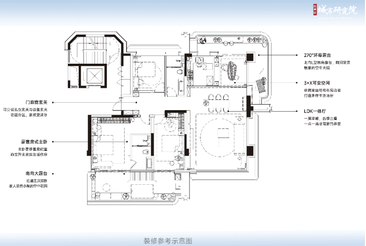 156㎡偶数层户型:项目打造南向270°环形跑道式浮岛大露台,搭配6.3米挑高冲击力超强,采光面、景观面都开到了IMAX级。