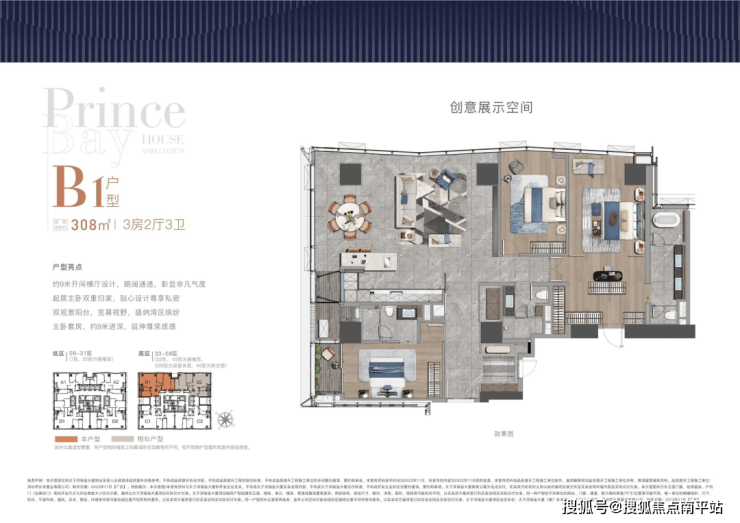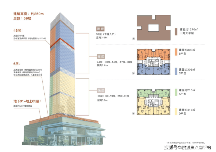 大平面大尺度定位,层高约3.6米,横厅设计确保最大化观景面,全户型纵享环幕视野。项目打造主力建面约215-415㎡纯粹品质公寓共191席,顶层为建面约1270㎡公寓产品。