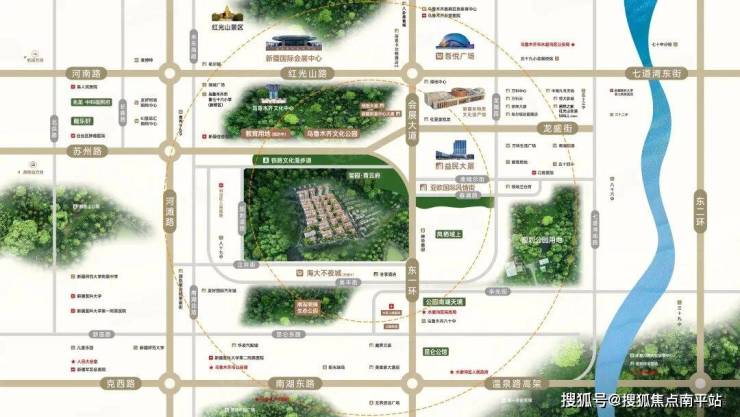 约 1191 亩 文化公园 、2500 亩 生态明珠公园 、15000 亩 红光山景区 环绕,推窗即见绿意,鲜氧时刻相伴。
