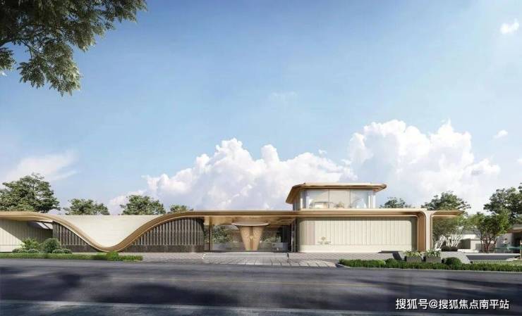社区大门:以凤凰花为灵感,屋檐使用香槟金铝板,立面采用大理石,尺寸为67米长*7.5米高。