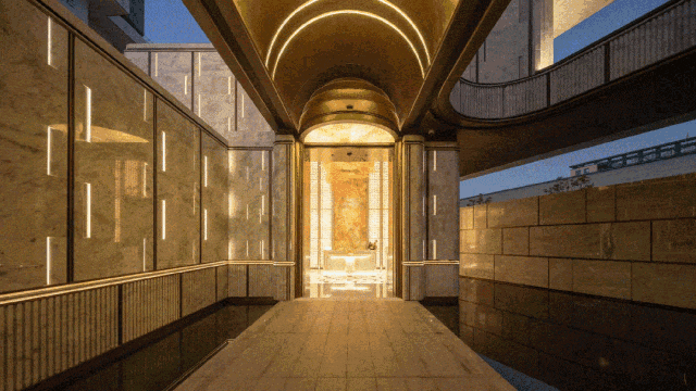 项目采用双大堂设计,负一楼的车马厅和一楼入户大堂已经实景呈现,将精致的艺术风格和用材用料,从地面延伸到地下。
