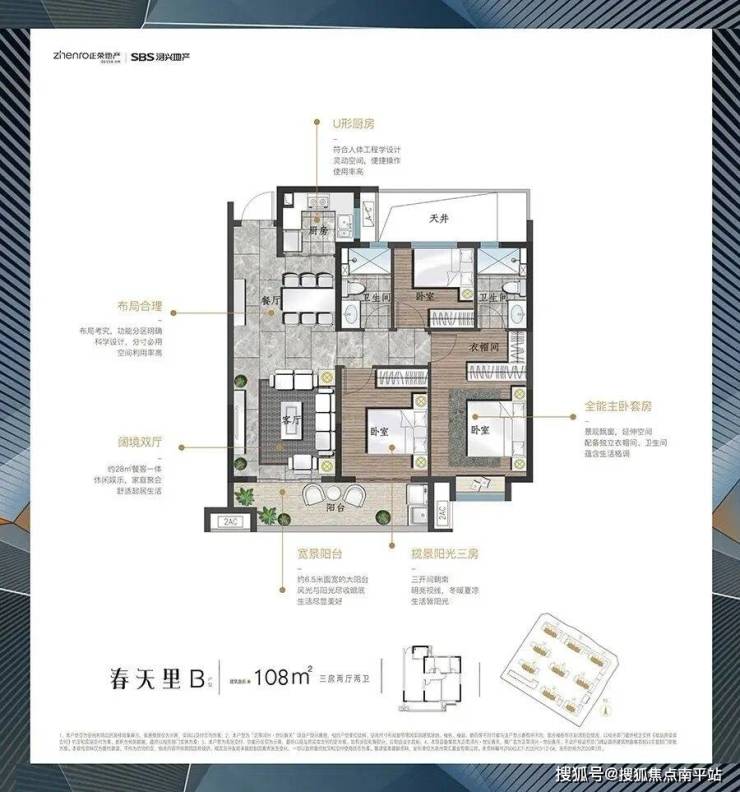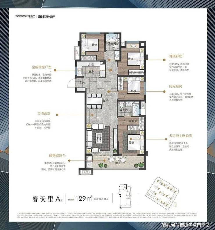 项目主推建面约108-129㎡的3-4房户型,全明户型,适合改善居住。