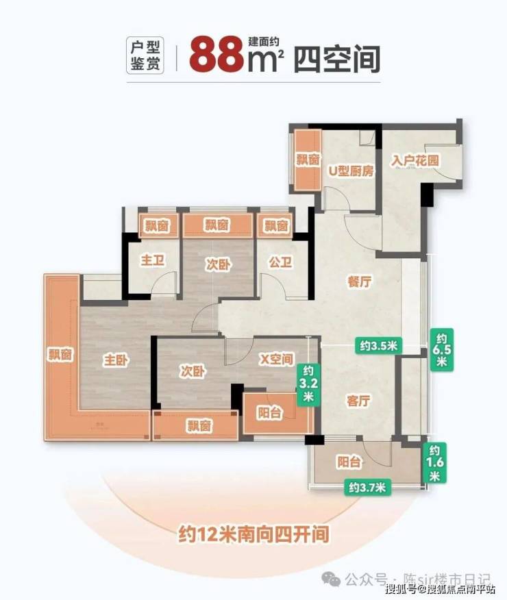 3,客餐厅等宽,开间约3.5米;若是打通X空间,客厅开间能达到约5.8米;阳台长约3.7米,进深约1.6米。
