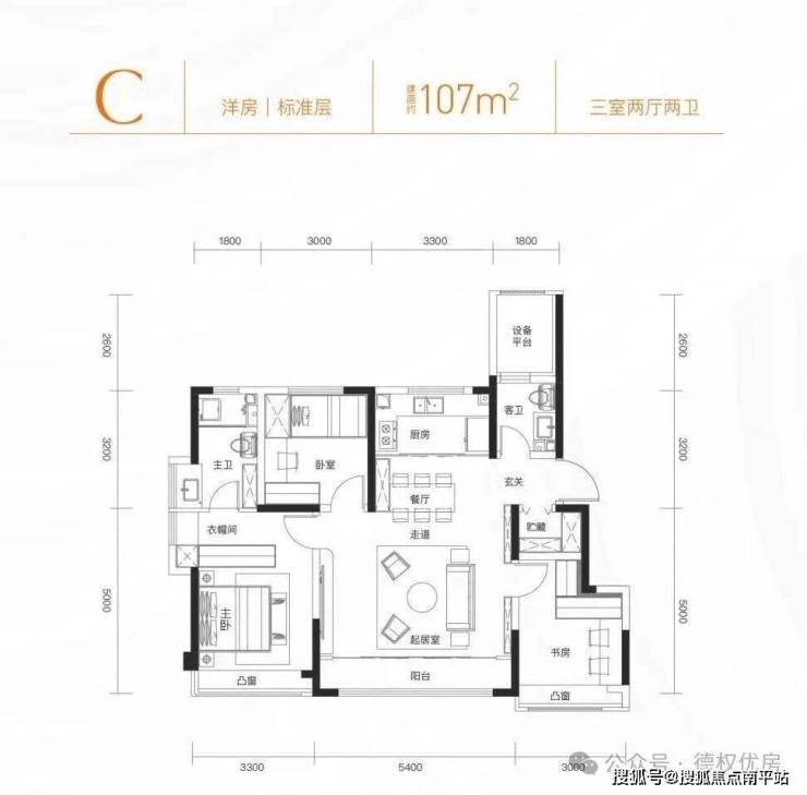 约11.7米南向大面宽,三开间朝阳,约5.4米方正宽厅,主卧套设计
