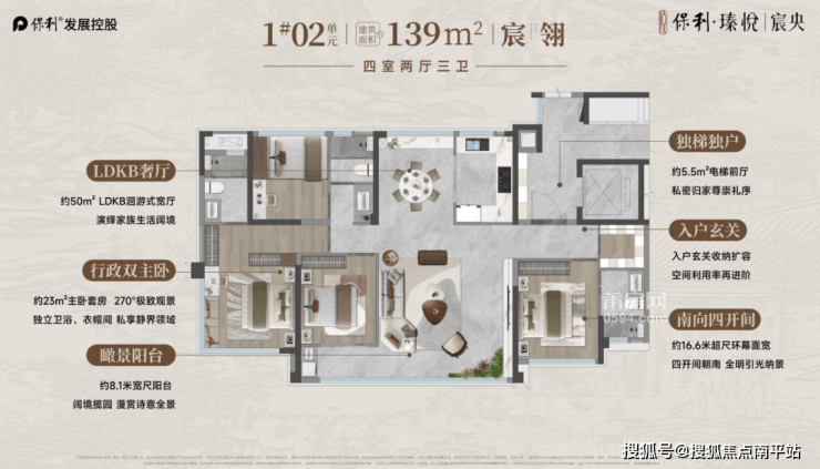 独梯独户配置+约5.5㎡电梯前厅,归家私密性拉满,尊享专属礼遇。约16.6米超尺环幕面宽+四开间朝南,8.1米宽阳台尽揽园景与文脉盛景。50㎡LDKB游式宽厅,空间开阔大气,23㎡主卧套房搭配270°极致观景窗,独立卫浴与衣帽间俱全,行政双主卧设计满足家族居住的私密需求,空间利用率再进阶,彰显改善家庭的尊崇生活质感。