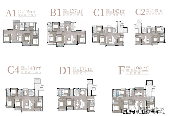 119㎡的户型是迄今为止,岛内用最小面积实现的两梯两户南北通透享受级的四房,199㎡户型是岛内同面积段5房设计唯一。