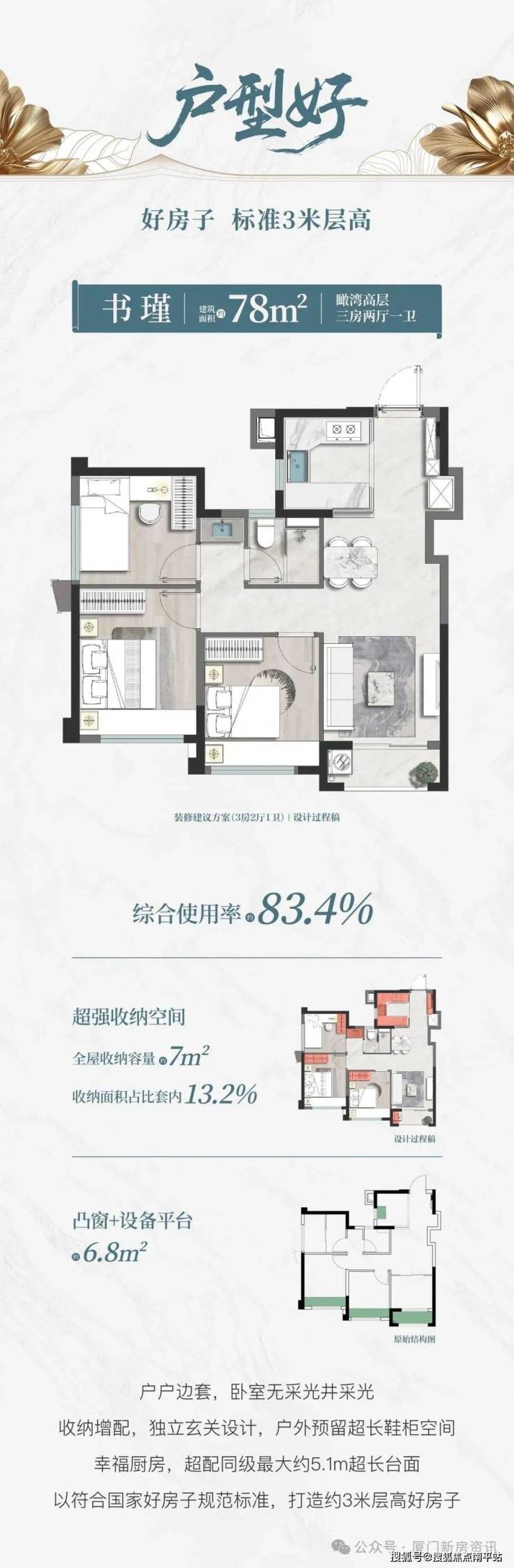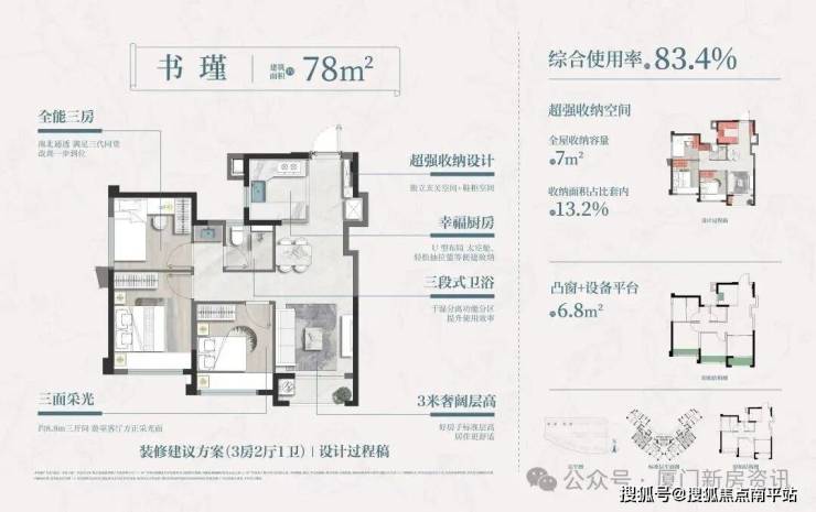 建发·书香云锦78㎡户型综合 得房率高达83.4%,空间高效利用,打破了刚需对上车产品的刻板印象。 不计产权面积约6.8㎡,相当于多送了一间小书房或储物间,妥妥的白捡的大便宜。而且该户型还做到 户户边套, 南北通透,卧室并非普通产品的采光井采光,而是正常的 开窗面采光,真正做到刚需产品改善的品质。
