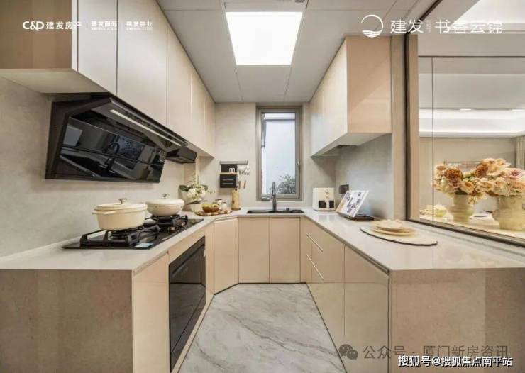 建发·书香云锦高的精装标准,在同区域内同档产品中位列前茅。比如:厨房采用的是建发 幸福厨房理念,在91㎡样板房可以看到,半开放式设计配玻璃隔断,空间大且通透!5.1米超长台面和餐厅移门互动方便。U型布局贴合人体工学,可一条龙操作,大窗户采光通风佳, 比传统110平厨房大,还留了双开门冰箱位,让烹饪成享受。