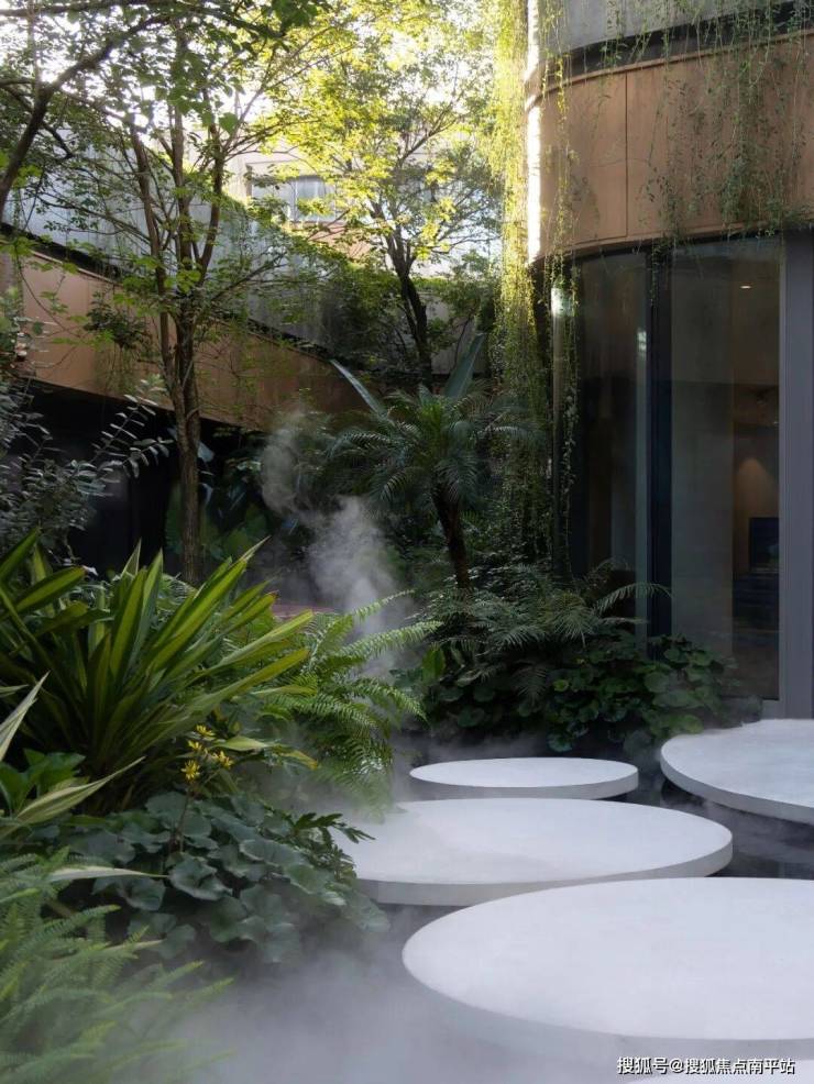 植物以阔叶树为骨架,搭配多种观叶植物、棕榈类植物,点缀色叶植物与艳丽八仙花,打造出温润绚烂、生机盎然的热带雨林氛围。