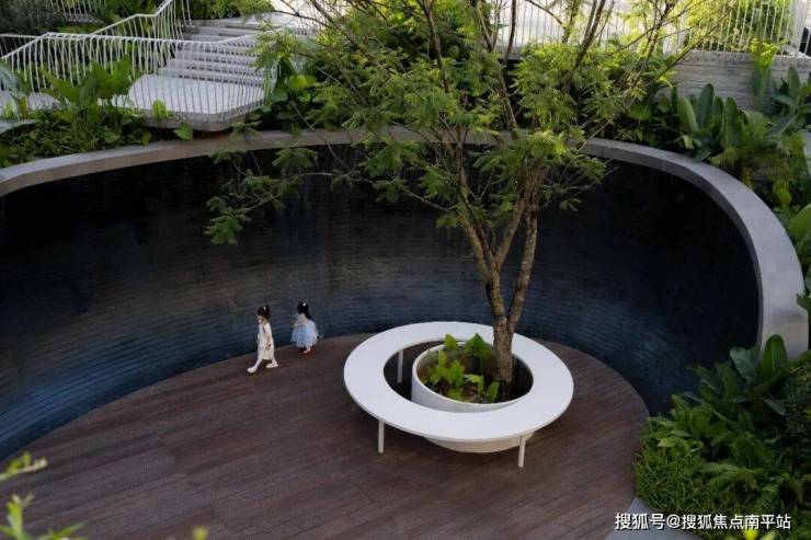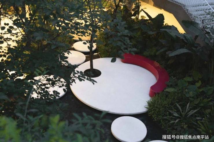 雨林花园以光影为笔,水系与植物空间相互渗透,让空间充满呼吸感与生机。洁白水磨石汀步搭配热烈红色坐凳,为整体增添浪漫气息。