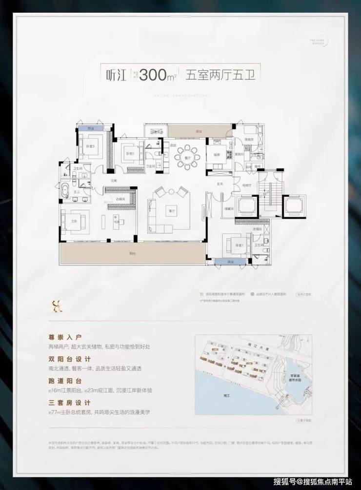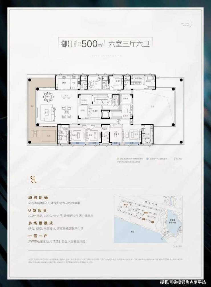 4、300-500㎡亲江平墅:创新结合大平层空间享受和别墅亲地性打造市场稀缺产品,其中500㎡尊享一层一户,致敬长沙塔尖人物;