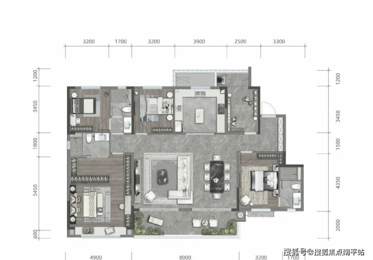 4+1房设计,大横厅开间约8米,如此尺度在别墅和洋房里非常少见!约17.8m南向超大面宽!约16㎡跑道式阳台!市场罕有3套房设计,南向主卧套房开间近5米,带独立的全房式衣帽间!