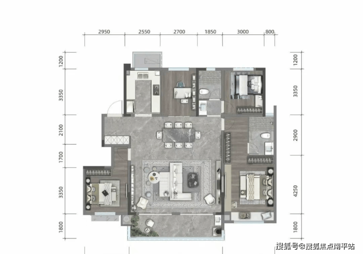 四叶草户型设计,面积0浪费;主卧开间达到了约3.8米,南向面宽足足有近14米。