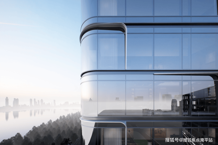 立面为全玻璃幕墙,辅以灰色层间铝板线条及香槟色浪花造型,写意江面星星点点的波光效果,打造立面层次感,增加精致度,同时结合近3米长转角圆弧的宽幅玻璃幕墙,形成室内外无界场景,揽江入室。