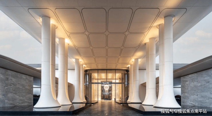 2.超尺度礼序入口:宽约21米、高约10米的社区主入口,强调礼序空间及超尺度的形象,通过两列8颗UHPC仿石巨柱及超大雨棚,营造庄重感与震撼感,强化项目形象IP。