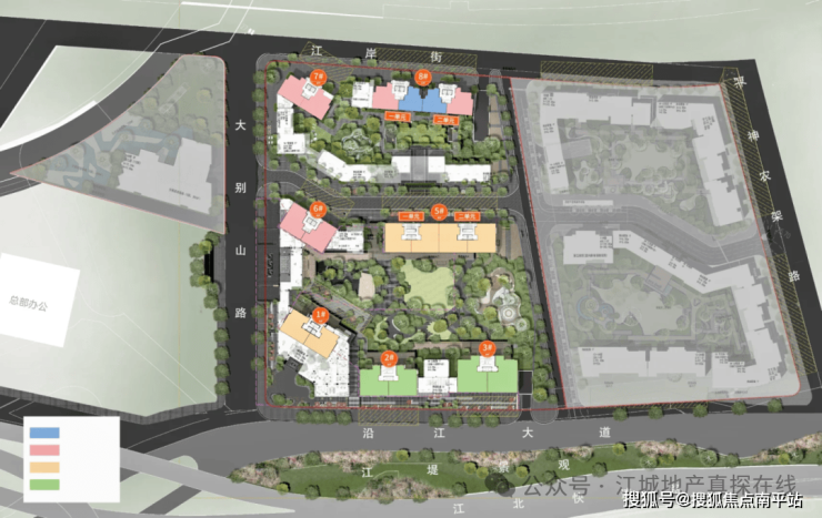 从规划图也可以看到,项目距离长江仅约100米左右,是一线临江楼盘,尤其是 最南向三栋楼为无高层遮挡的一线观江,地块也比较完整,朝向和视野较好,住宅楼栋面江由低到高排布,保证了看江房源数量的最大化。